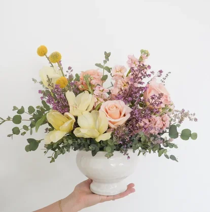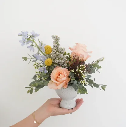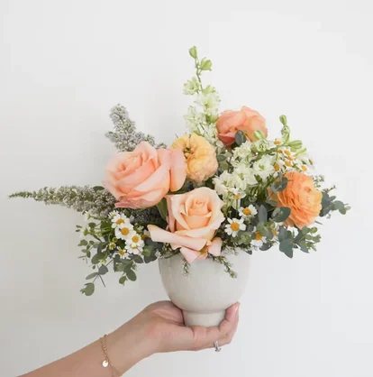 Our Signature Arrangement is lovingly handcrafted with modern in season blooms + colors with filler and greenery, designed in a re-usable vase.